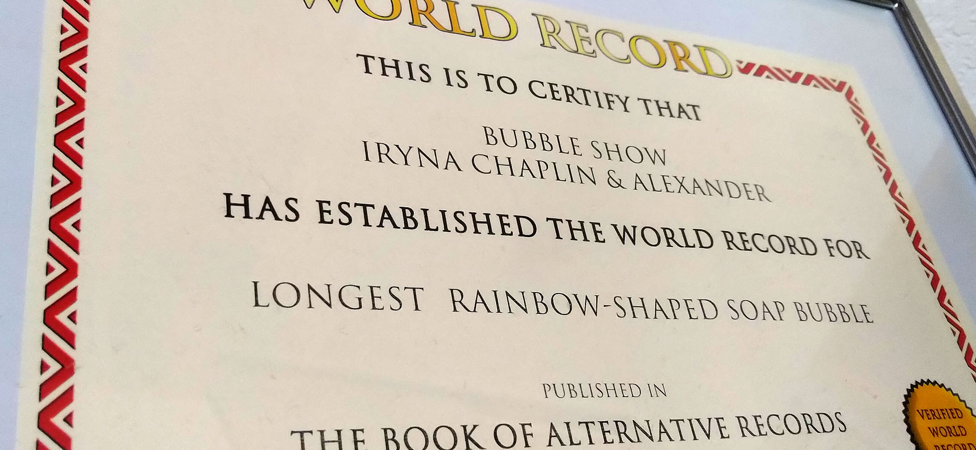 «... Jetzt kann man seit wenigen Wochen im 600 Personen faßenden Waldtheater täglich einen Weltrekord bestaunen. Vor begeisterten Besuchern und insbesondere vor glänzenden Kinderaugen präsentieren Iryna Chaplin und Alexander in einer faszinierenden Seifenblasenshow die längste Seifenblase der Welt. Die britische Kommißion bestätigte mit entsprechender Urkunde den Weltrekord am 25. November 2009. Mit beeindruckenden Lichtreflexen entstehen in der Show Seifenblasen in unterschiedlichen Größen und Farben, die teilweise wiederum mit Seifenblasen oder mit Rauch gefüllt werden und dann aufsteigen oder zu Boden fallen. Besonders großen Beifall bekommt das Künstlerpaar, wenn es Kinder aus dem Publikum auf der Bühne bittet und in eine große, in Regenbogenfarben glänzende Seifenblase einhüllt. Dieser Weltrekord gelingt bei fast jedem ersten Versuch...»